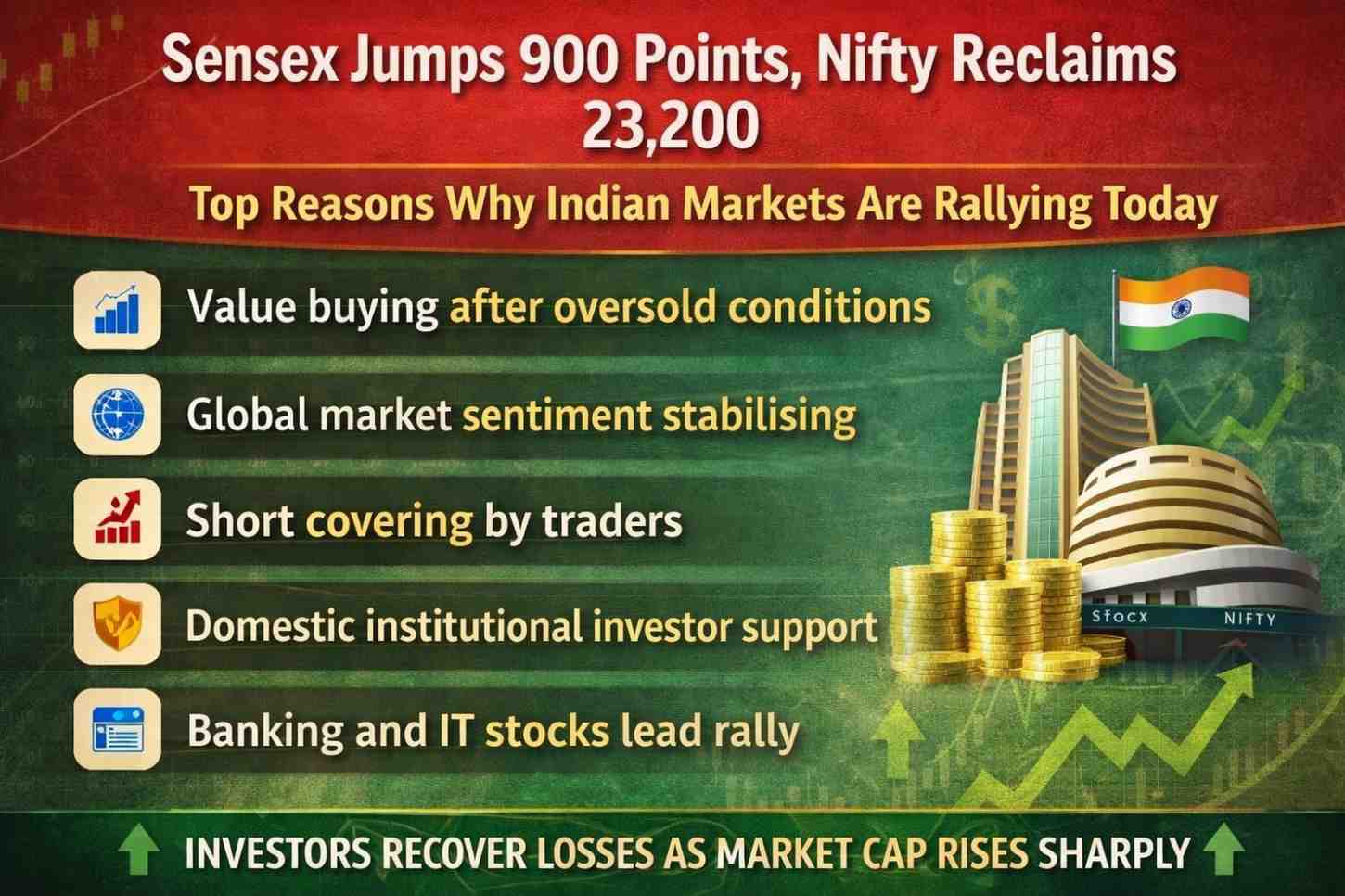 Indian equity benchmarks staged a strong rebound on Friday, with the BSE Sensex surging over 900 points and the Nifty 50 reclaiming the crucial 23,200