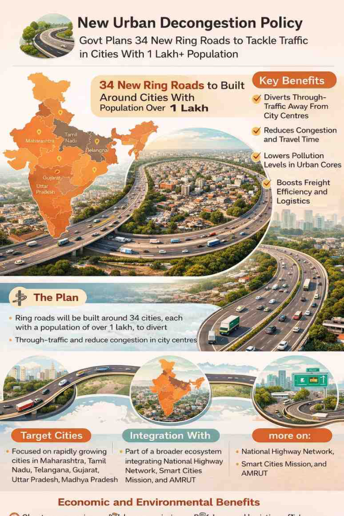 India’s chronic urban traffic problem, long seen as an unavoidable side effect of rapid growth, is now at the centre of a major policy rethink. The Union government is preparing to roll out a new Urban Decongestion Policy that proposes the construction of 34 new ring roads around cities with populations exceeding one lakh. The move marks one of the most ambitious attempts yet to systematically ease congestion, cut travel time, and improve the quality of urban life across fast-growing towns and mid-sized cities.